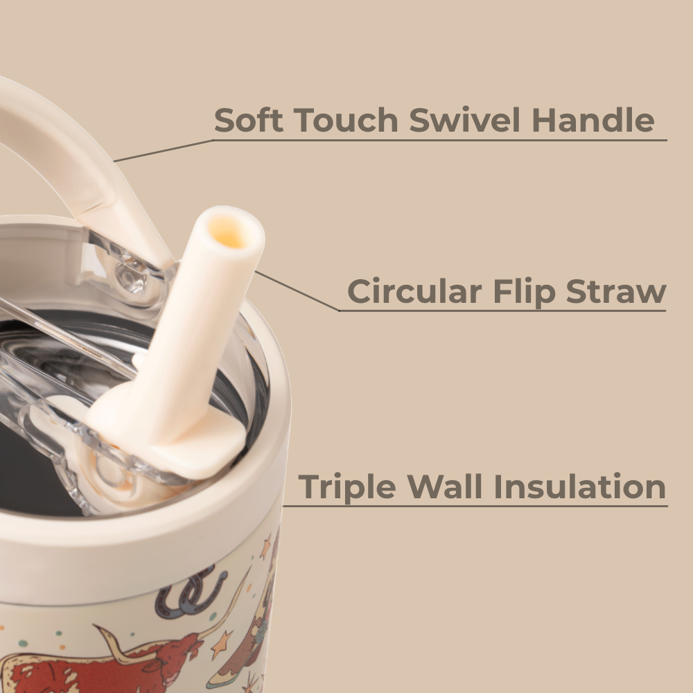 Made for active lifestyles of all ages, the Sport 20oz in Rodeo delivers dependable hydration in a compact, portable size. With its cream base decorated with longhorns, boots, cacti, and moons, this water bottle adds a western-inspired design while supporting hydration for kids at school or adults on the go. The 20oz size is the smallest in the Sport collection ��� lightweight, easy to carry, and sized to fit into backpacks, gym bags, and standard cup holders. Made from 18/8 stainless steel with triple-wall insulation, the Rodeo tumbler keeps drinks cold for hours, and its dishwasher-safe body makes cleaning quick and simple. Despite its smaller build, it carries all the performance features of larger Sport bottles: it���s completely leakproof with the straw down, fitted with a circular flip straw for smooth sipping, and equipped with an ergonomic bucket handle for easy transport. A protective rubber base adds durability, reduces noise, and helps protect surfaces. Compact, tough, and practical, insulated water bottle is hydration designed for both kids��� adventures and adults��� everyday routines. Dimensions: 3.4" x 3.4" x 7.64" Base diameter: 2.59" Capacity: 20 ounces of water ~ 592 mL Weight: 14.72oz ��� WARNING: CHOKING HAZARD ��� Small Parts. This product contains small components that may pose a choking risk. Not suitable for children under 3 years old. Inspect regularly for damage. For questions or concerns, contact customer support.