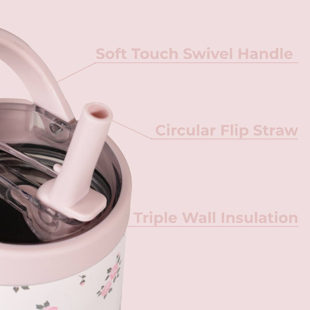 Stay consistent with your hydration using the Sport 32oz in Wildrose. With its cream base patterned with soft pink roses and green leaves, this insulated water bottle adds a subtle design detail while supporting hydration for workouts, travel, and daily routines. The 32oz size provides the perfect balance ��� big enough to reduce refills during long days, yet lightweight and portable for on-the-go use. Made from 18/8 stainless steel with triple-wall insulation, the Wildrose tumbler keeps drinks cold for hours, and its dishwasher-safe build makes cleaning simple. Designed for active lifestyles, it���s completely leakproof with the straw down, fitted with a circular flip straw for smooth sipping, and built with a cupholder-friendly tapered base. Ergonomic side grips provide a steady hold during activity, while the bucket handle and protective rubber base add durability and everyday convenience. Practical, dependable, and portable, the Sport bottle is hydration designed for performance, wellness, and movement in daily life. Dimensions: 3.65" x 3.65" x 10" Base diameter: 2.92" Capacity: 32 ounces of water ~ 946 mL Weight: 16oz