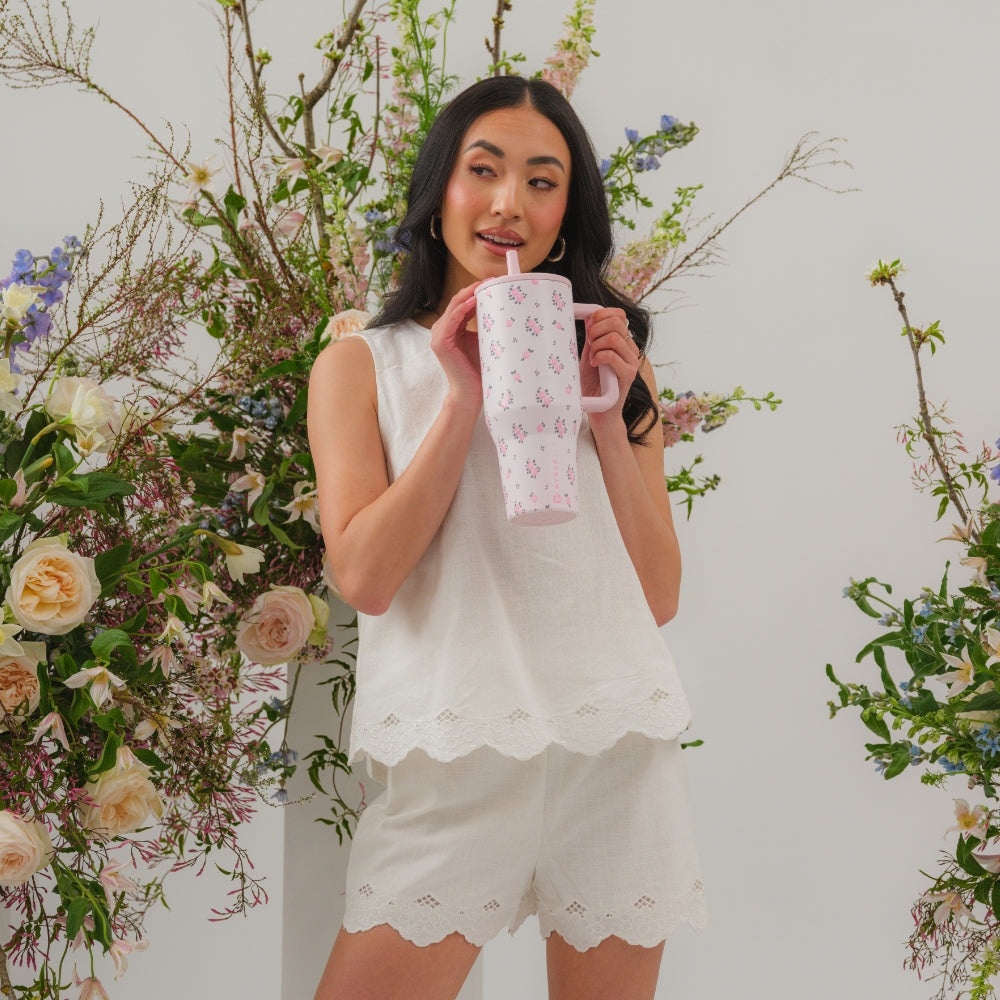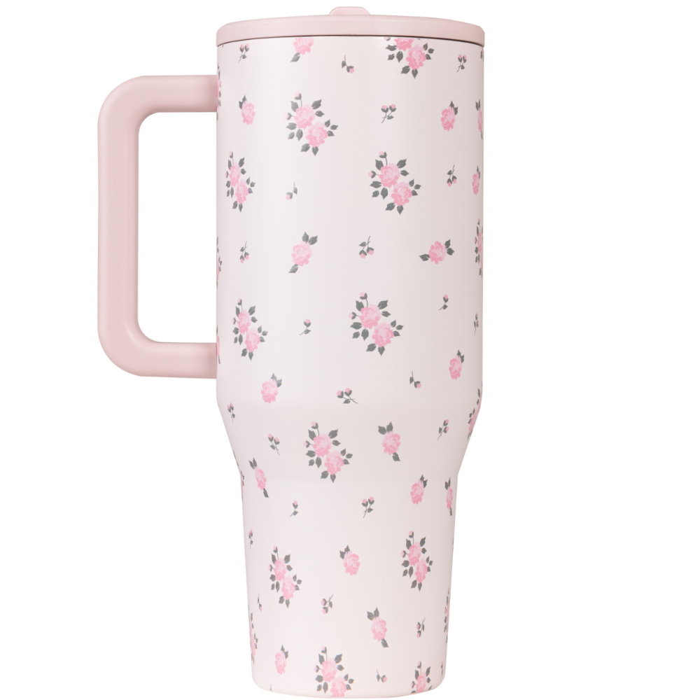 Stay consistent with your hydration goals using the Traveler 40oz in Wildrose. With its soft floral pattern, this water bottle brings a subtle touch of style to your daily routine while helping you stay refreshed during workouts, long office hours, or time on the go. Crafted from durable stainless steel with triple-wall insulation, the Wildrose tumbler keeps water cold for hours and is built to handle everyday use. Its 40oz capacity provides lasting hydration with fewer refills, making it easier to stay on track with your water intake. For convenience, it���s completely leakproof with the straw down, equipped with a flip-straw lid for easy sipping, and designed with a cupholder-friendly base. An ergonomic handle makes it simple to carry, while the dishwasher-safe design ensures quick and effortless cleaning. The Traveler 40oz combines capacity, durability, and ease of use, making it a reliable insulated water bottle that supports health and wellness in everyday life. Dimensions: 3.9" x 6" x 9.84" Base diameter: 3.04" Capacity: 40 ounces of water ~ 1183 mL Weight: 20oz